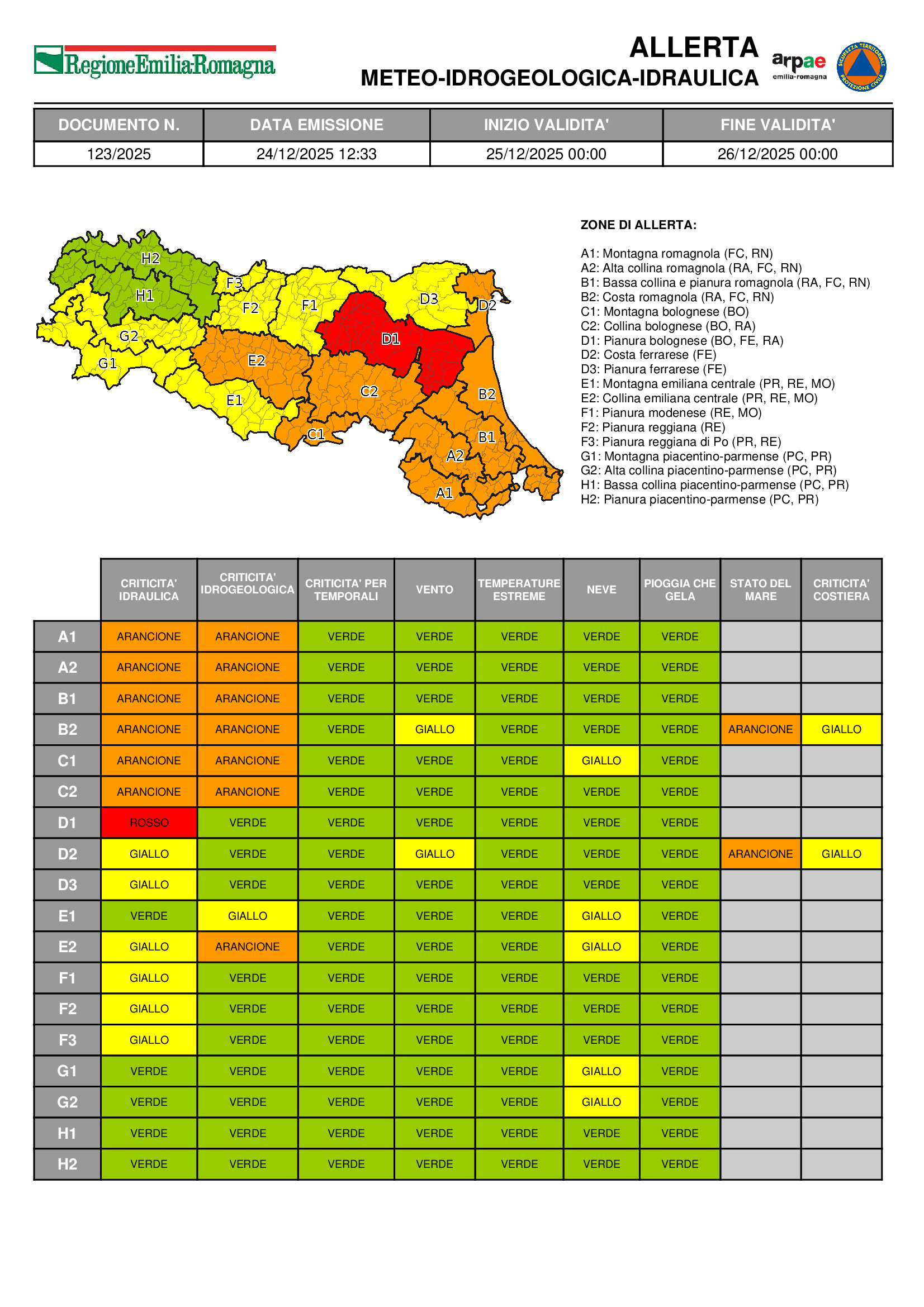 Per giovedì 25 dicembre sono previste precipitazioni diffuse e persistenti, soprattutto sul settore centrale della regione, che potranno generare diffusi fenomeni franosi, ruscellamento lungo i versanti e innalzamenti dei livelli idrometrici nei corsi d’acqua con superamenti della soglia 2. Il codice colore rosso della zona D1 è relativo ai superamenti della soglia 3 sugli affluenti in destra Reno con alimentazione collinare. Sui settori appenninici e collinari emiliani i fenomeni saranno nevosi a partire da quote attorno ai 300/400 metri, con accumuli di 5-15 cm sulle zone collinari e di ulteriori 20-30 cm sulle zone montuose. Lungo la fascia costiera sono inoltre previsti venti di burrasca moderata (62-74 km/h) da nord-est, con rinforzi o raffiche di intensità superiore, con mare agitato, localizzati fenomeni di erosione dei litorali, delle dune e degli argini invernali, nonché ingressioni marine che possono interessare gli stabilimenti balneari. Saranno possibili inoltre esondazioni di fiumi e canali alla foce, per le difficoltà di deflusso delle piene in mare.