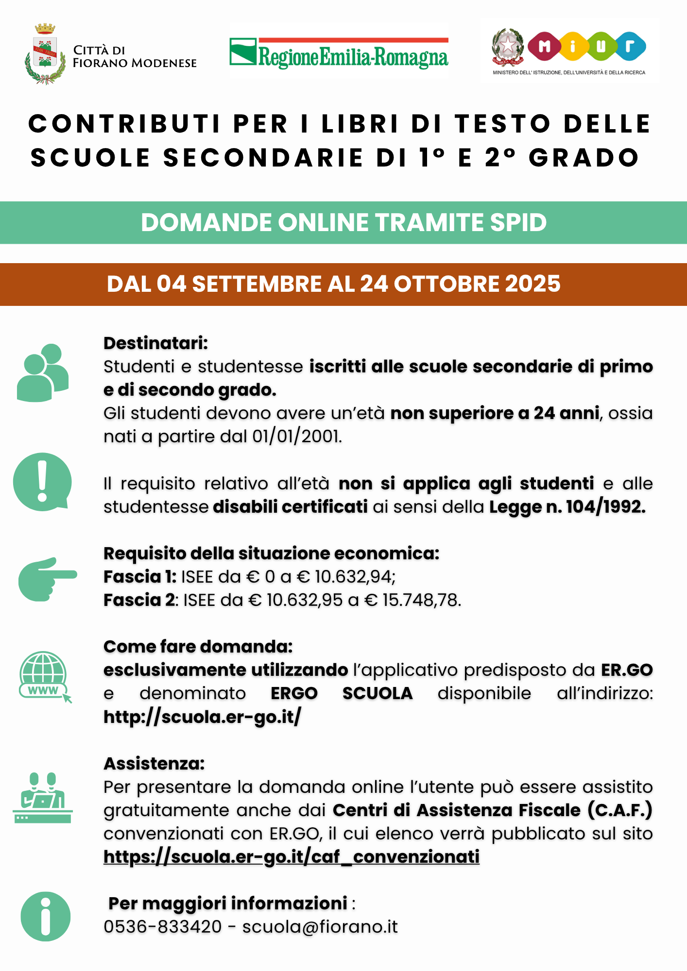 Per assistenza nella compilazione della domanda, è possibile rivolgersi ai CAF convenzionati con ER.GO, il cui elenco è disponibile al link https://scuola.er-go.it/caf_convenzionati.