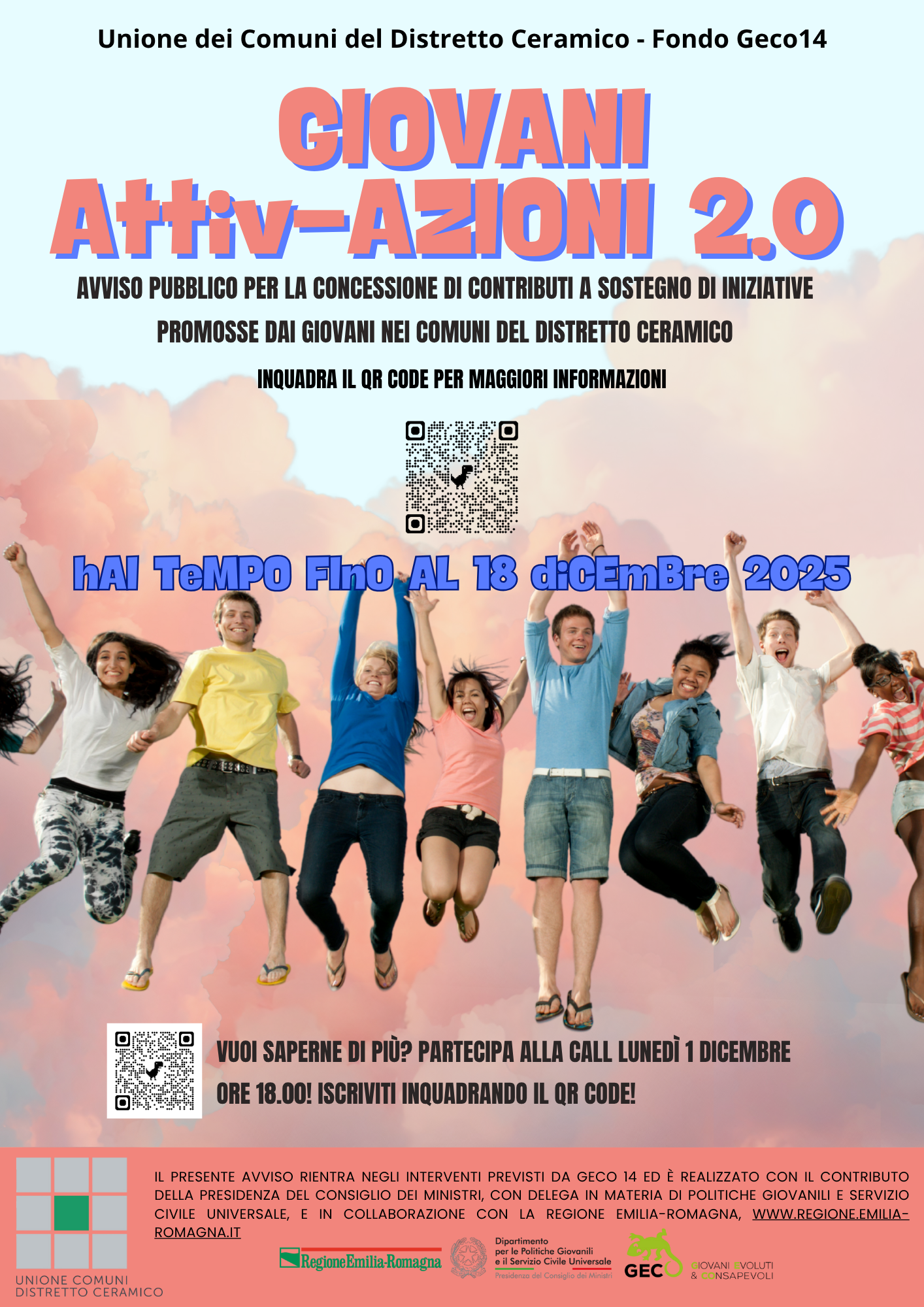 Bando e informazioni: https://www.distrettoceramico.mo.it/novita/avvisi/giovani-attiv-azioni-2-0-fondo-geco-14