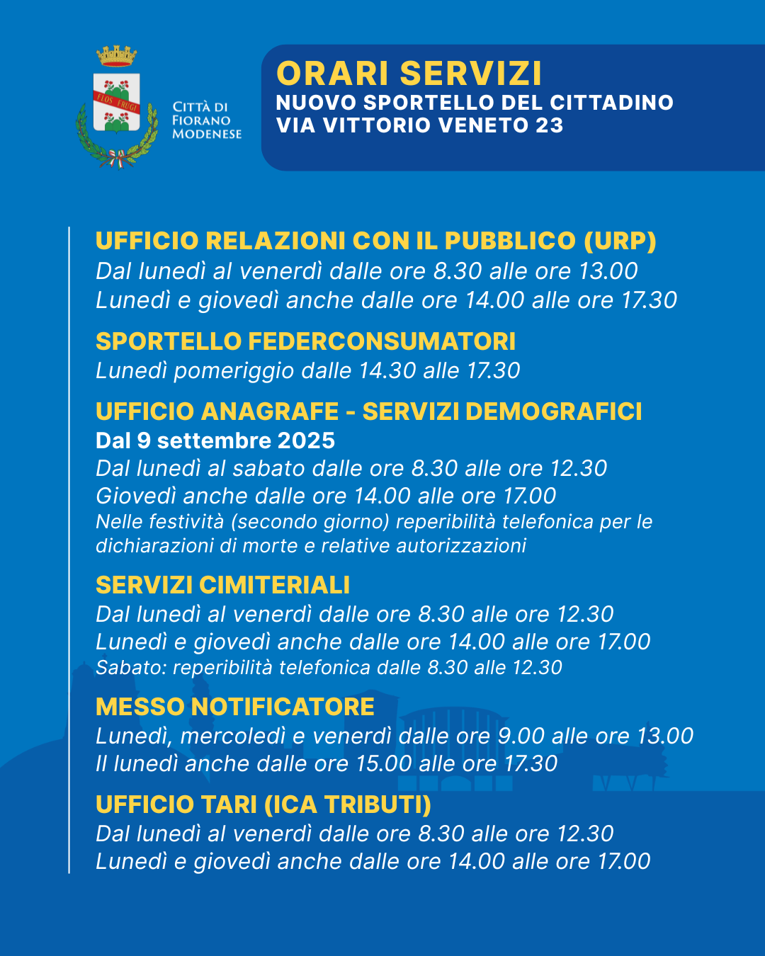 Da martedì 9 settembre 2025 i servizi Demografici, presso lo Sportello del Cittadino, con ingresso in via Ferri 9, riprenderanno gli orari “invernali” con l’apertura il sabato mattina, dalle 8.30 alle 12.30. Resta invariata l’apertura al pubblico dal lunedì al venerdì dalle 8.30 alle 12.30 e il giovedì pomeriggio dalle 14 alle 17.