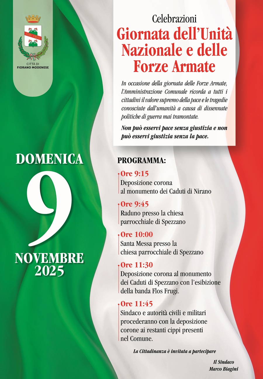 Domenica 9 novembre 2025 si svolgeranno a Fiorano Modenese le celebrazioni per la Giornata dell’Unità Nazionale e delle Forze Armate, in occasione del 107° anniversario della fine della Prima Guerra Mondiale, ricordando il supremo valore della pace e che non può esservi pace senza giustizia e giustizia senza pace.