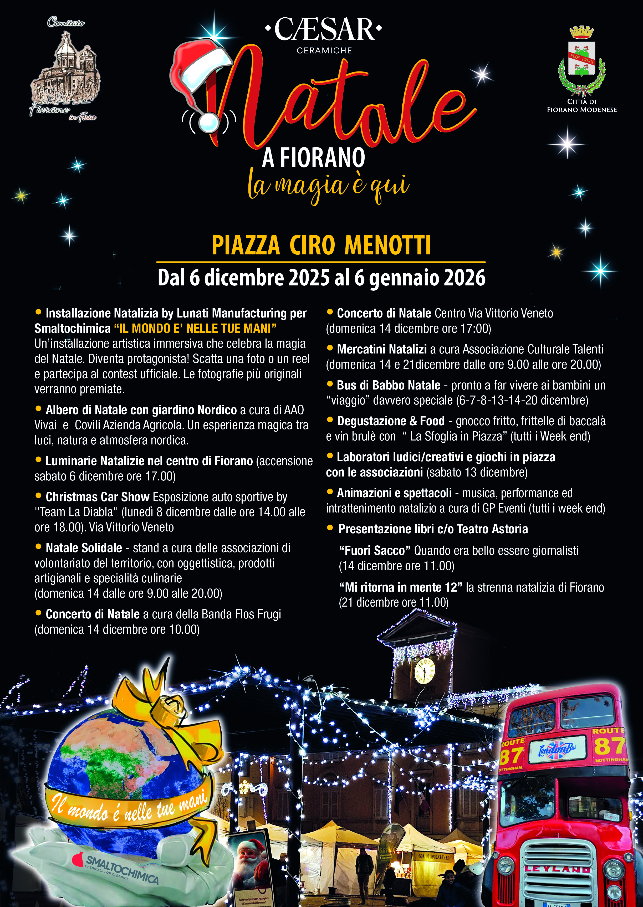 Dal 6 dicembre fino al 6 gennaio, la gioia del Natale torna ad illuminare Fiorano Modenese con il grande albero di Natale e il giardino nordico in piazza Ciro Menotti, le luminarie per le vie del centro e una nuova originale installazione natalizia di Lunati Manufacturing Ideas, dal titolo “Il mondo è nelle tue mani”.