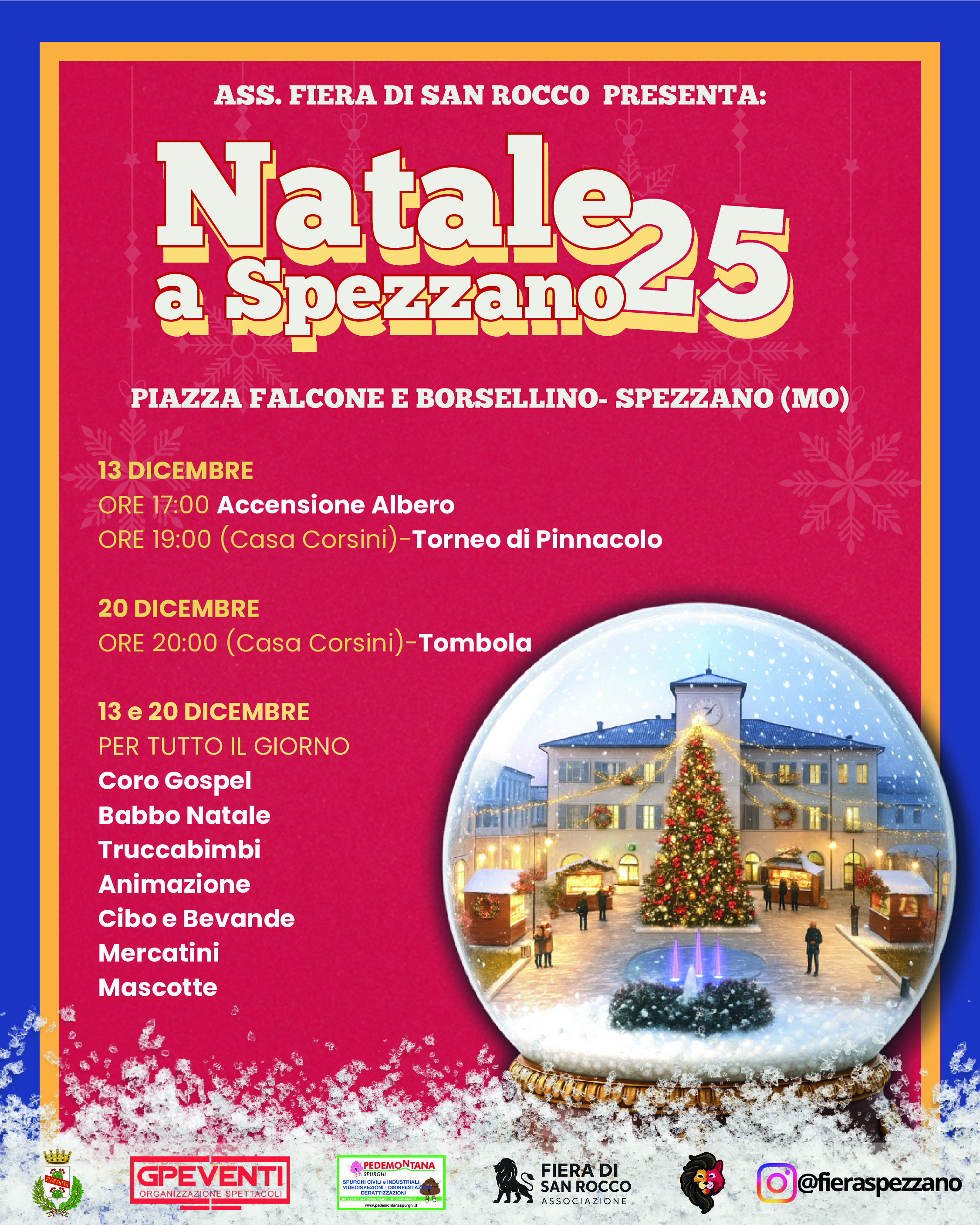 Il programma degli eventi in centro a Fiorano è curato dal Comitato Fiorano in Festa, le iniziative in piazza Ciro Menotti sono tutte gratuite e sostenute da Cesar Ceramiche; AAO Vivai e Azienda agricola Covili hanno allestito l’albero di Natale e il giardino nordico. Gli appuntamenti natalizi a Spezzano sono sostenuti da Pedemontana Spurghi. L’organizzazione tecnica è per entrambe le piazze di GP Eventi.