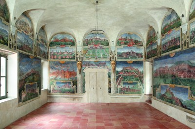 Di particolare pregio la Sala delle Vedute, affrescata intorno al 1596 da Cesare Baglione, pittore di corte dei signori Farnese di Parma, che ritrae i domini di Marco III Pio di Savoia e della moglie Clelia Farnese; un ciclo affrescato di 57 vedute di castelli, torri e borghi, dalla pianura alla montagna, dello Stato di Sassuolo, suddiviso in cinque podesterie: Sassuolo, Spezzano, Formigine, Brandola, Soliera.