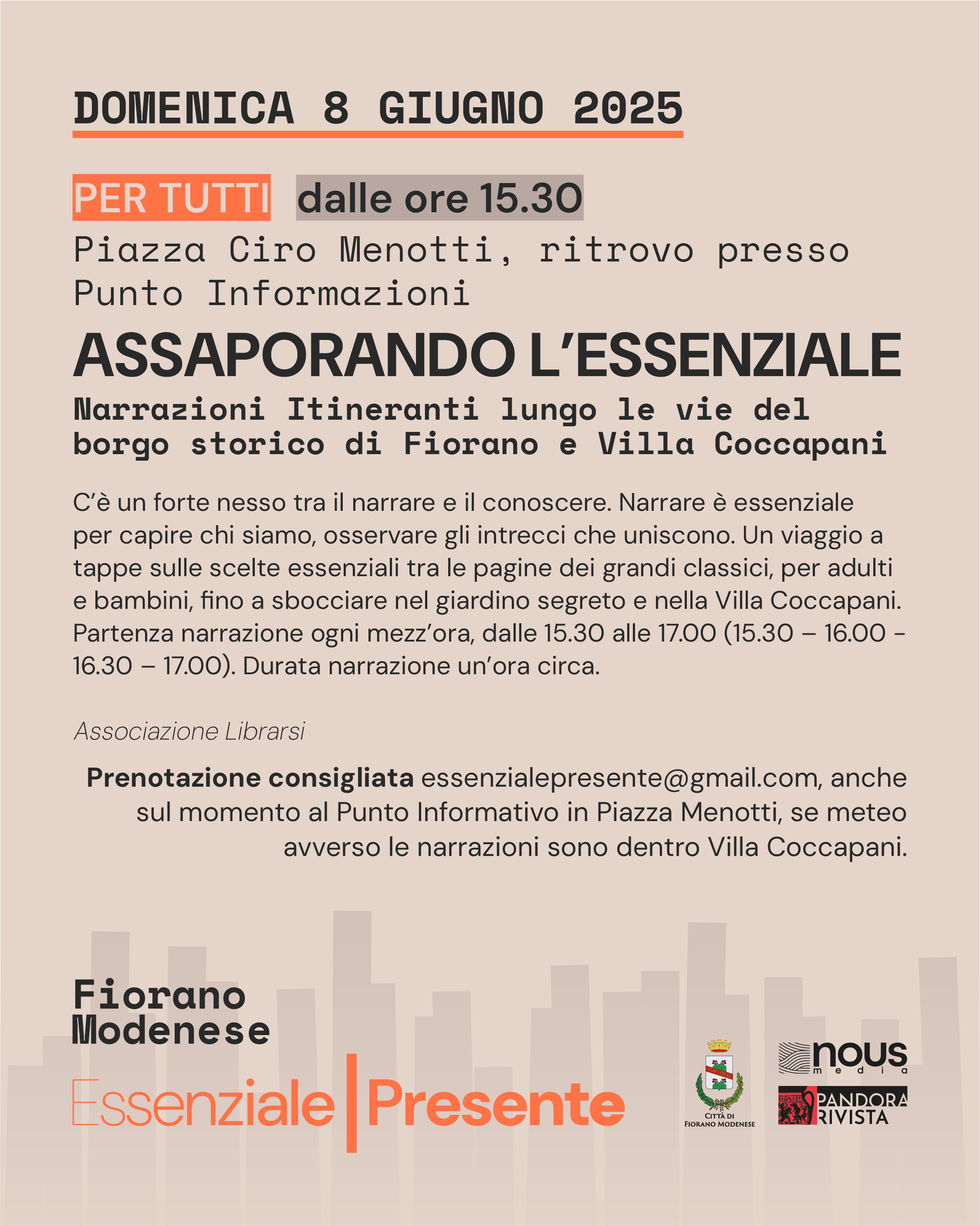 Prenotazione consigliata essenzialepresente@gmail.com, anche sul momento al Punto Informativo in Piazza Menotti, se meteo avverso le narrazioni sono dentro Villa Coccapani