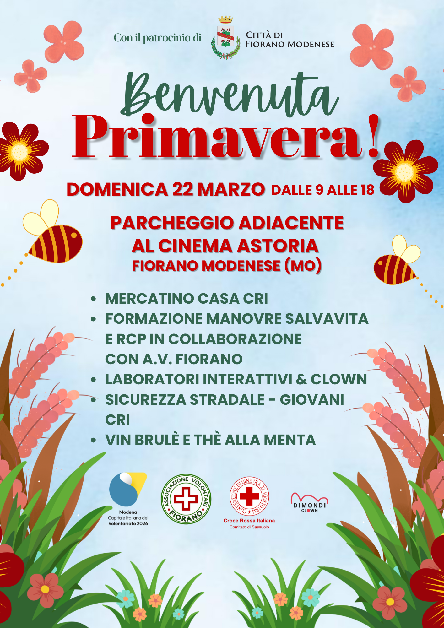 Dalle 9 alle 18, nel parcheggio adiacente al teatro Astoria, in centro a Fiorano, AVF (Associazione Volontari Fiorano) e Croce Rossa Italiana, Comitato di Sassuolo, propongono l’iniziativa “Benvenuta Primavera”, una giornata dedicata alla solidarietà, alla prevenzione e alla condivisione. Saranno presenti diversi stand e attività: il mercatino della CRI, lo stand informativo sulle manovre di disostruzione pediatrica e rianimazione e “On the Road”, laboratori interattivi e clown, punto informativo sulla sicurezza stradale con i giovani della Croce Rossa, oltre a un punto ristoro con tè alla menta e vin brulé.