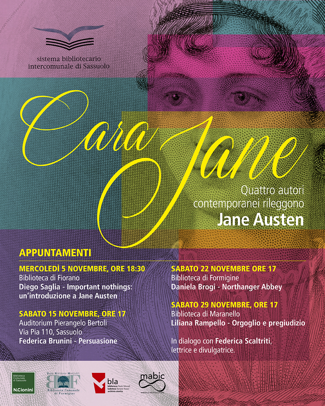 A duecentocinquanta anni dalla nascita di Jane Austen, le sue opere continuano a parlarci, a farci riflettere e a ispirarci: ci interrogano sull’amore, sull’identità, sul ruolo delle donne nella società e sul sottile equilibrio tra ragione e sentimento. Quattro autori e autrici contemporanei rileggono i suoi capolavori in quattro incontri, nelle quattro biblioteche del Sistema bibliotecario di Sassuolo.