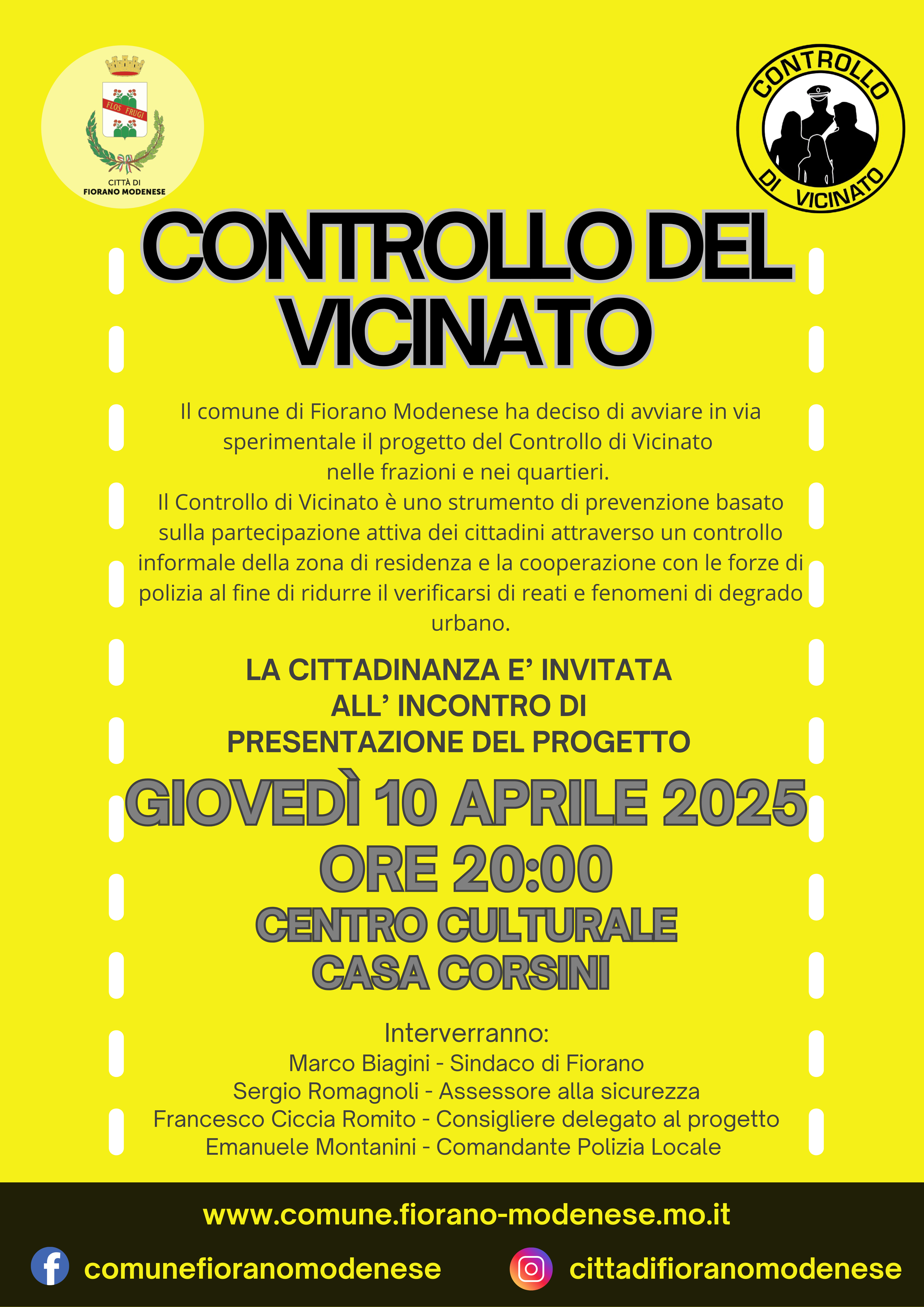 Il Comune di Fiorano Modenese ha deciso di avviare, in via sperimentale, il progetto " Controllo di vicinato" nelle frazioni e nei quartieri.