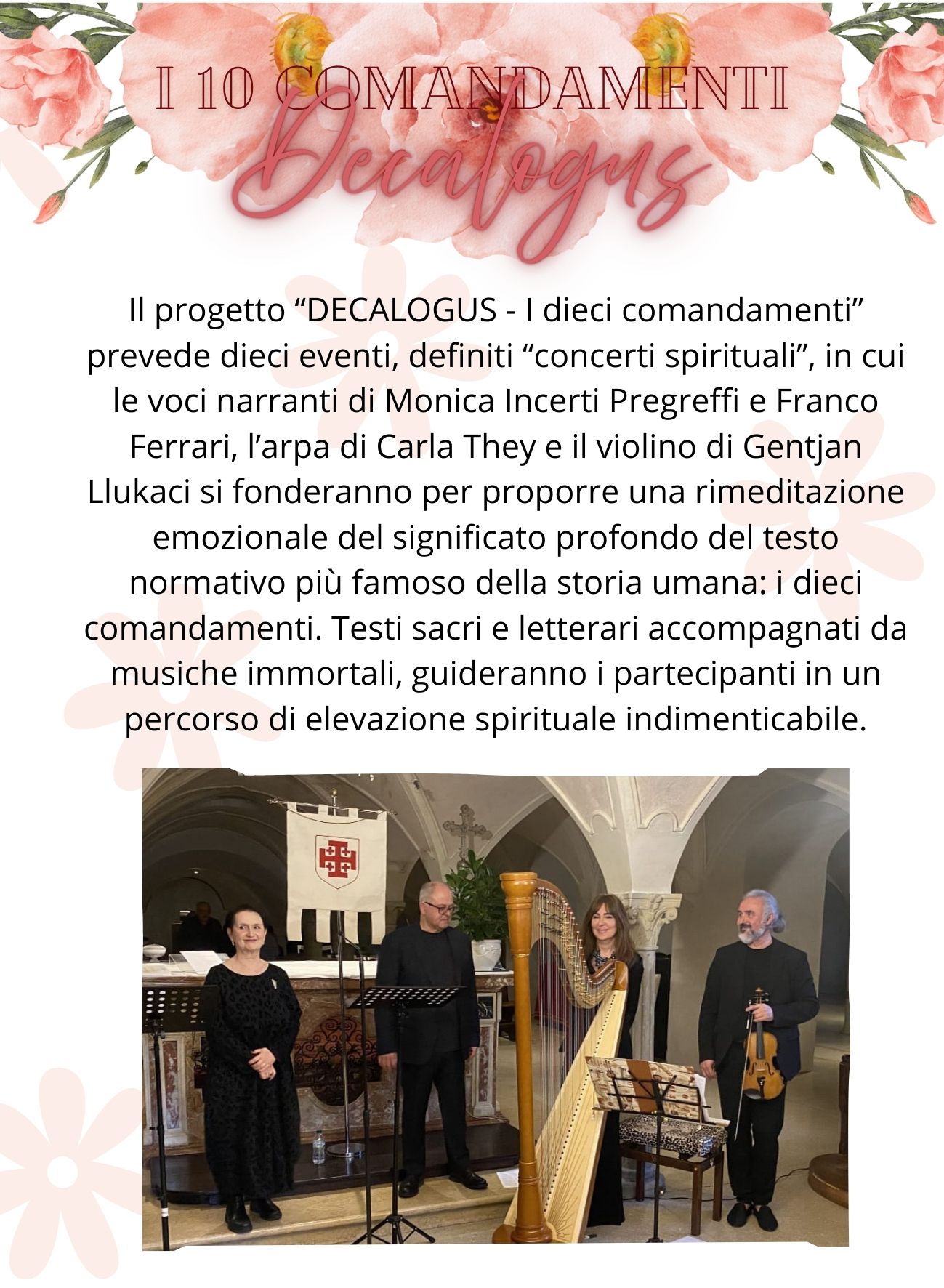Il progetto "Decalogus - I dieci comandamenti" prevede dieci eventi, definiti "concerti spirituali", in cui le voci narranti di Monica Incerti Pregreffi e Franco Ferrari, l'arpa di Carla They e il violino di Gentjan Llukaci.