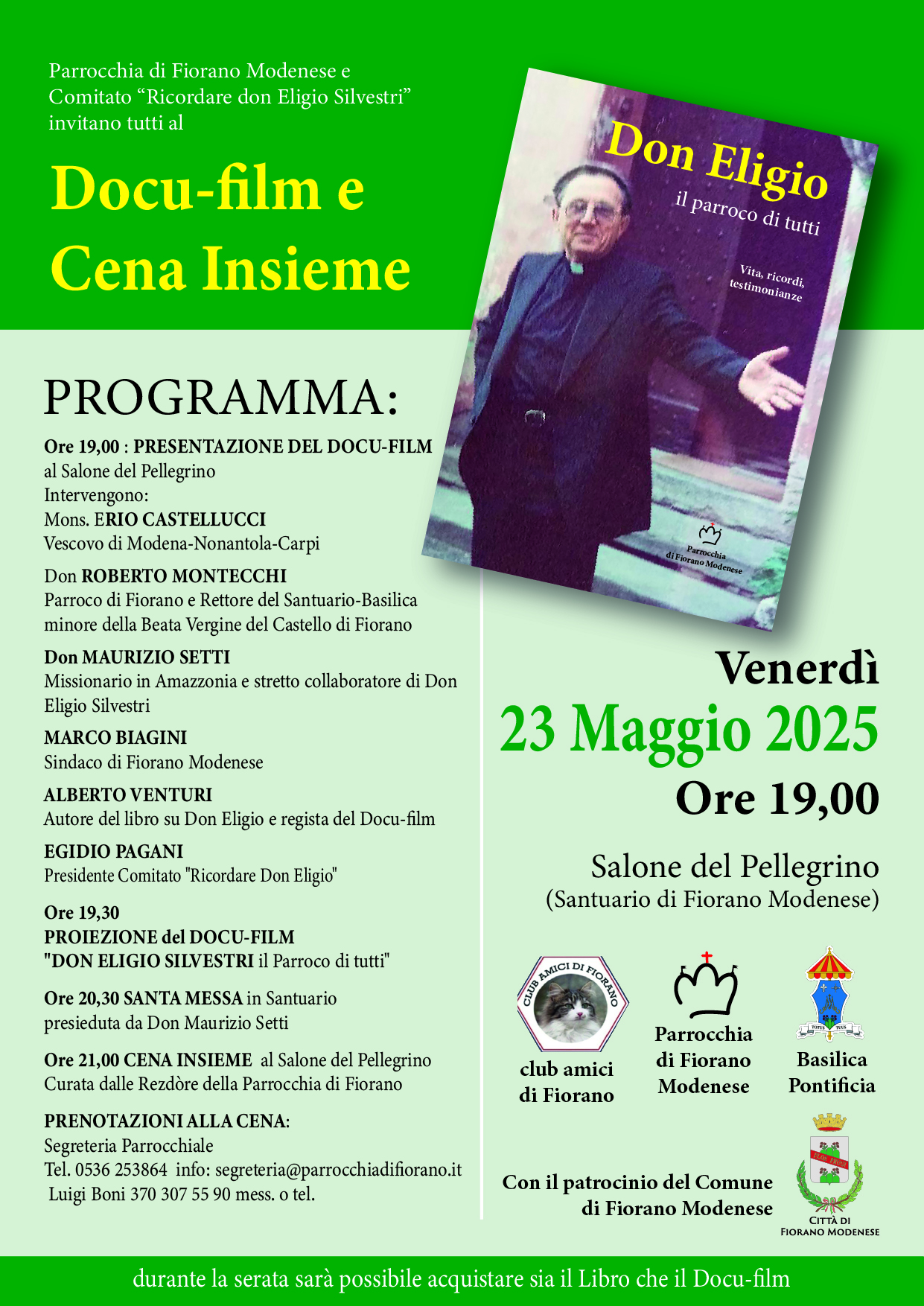 Ore 19:00 presentazione del docu-film con la presenza di Mons. Erio Castellucci Vescovo di Modena/Carpi/Nonantola, Don Roberto Montecchi parroco di Fiorano e Rettore del Santuario/Basilica, Don Maurizio Setti missionario in Amazzonia e collaboratore di Don Eligio, Marco Biagini Sindaco di Fiorano, Alberto Venturi autore del libro e del docu-film e Egidio Pagani presidente comitato "Ricordare Don Eligio".