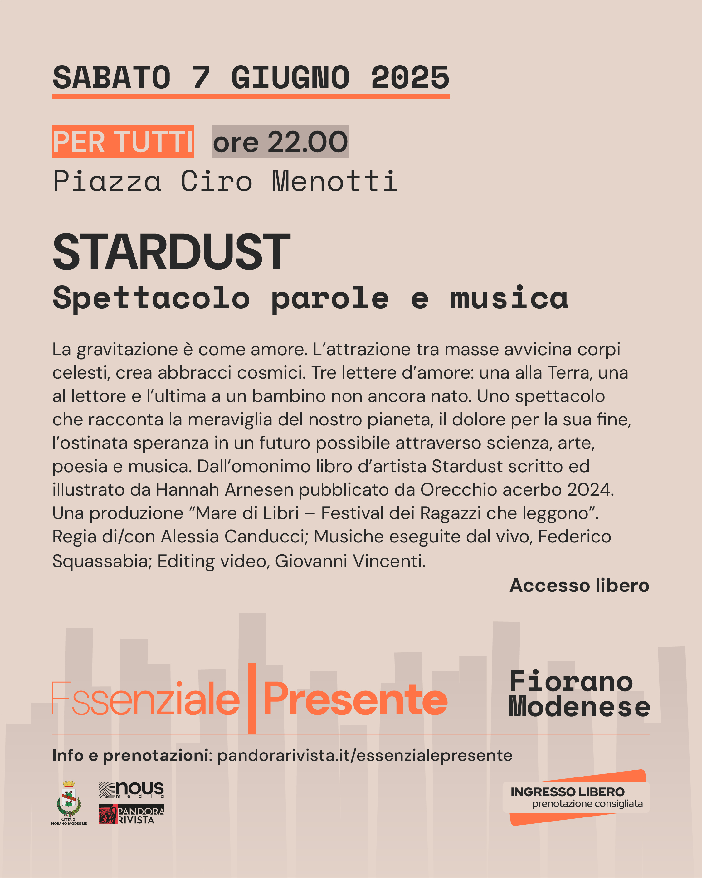 Essenziale/Presente, un nuovo festival a Fiorano Modenese, con ospiti d'eccezione, promossa dal Comune e da Pandora Rivista. Un'occasione per riflettere sulle "cose essenziali" in un presente inquieto e segnato da trasformazioni profonde. Dialoghi, incontri, esperienze, workshop e laboratori per adulti e ragazzi.