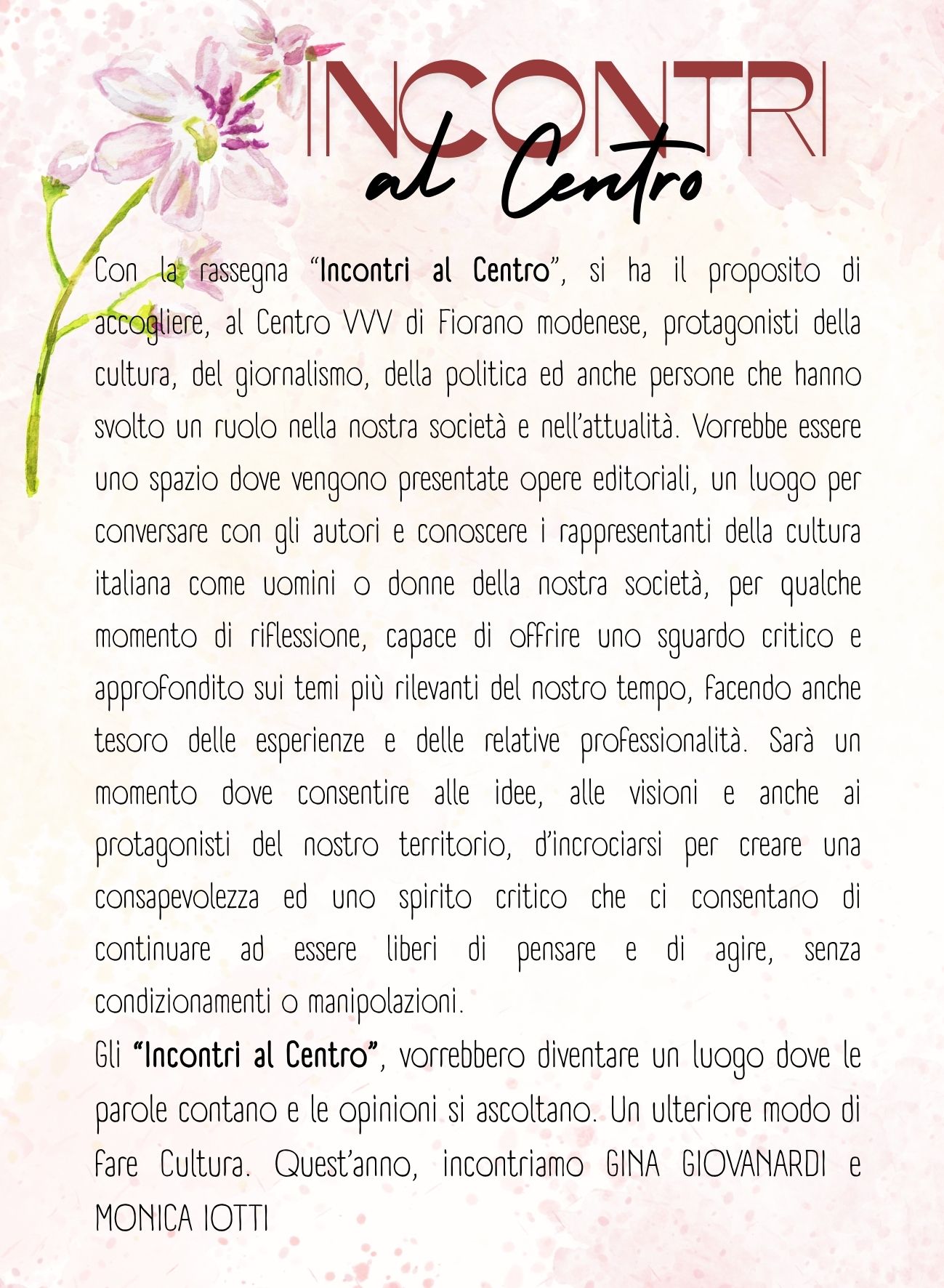 La rassegna "Incontri al Centro" ha il proposito di accogliere al CVVV protagonisti della cultura, del giornalismo, della politica ed anche persone che hanno svolto un ruolo nella nostra società e nell'attualità.
