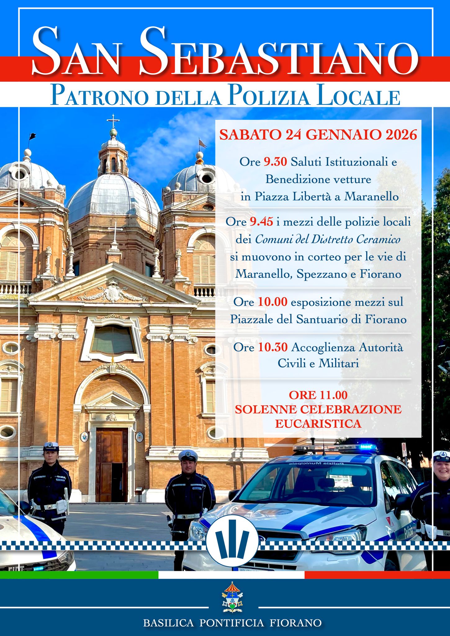 Sabato 24 gennaio 2026, alle ore 11, presso la Basilica pontificia di Fiorano Modenese, si svolgerà la celebrazione eucaristica in onore a San Sebastiano, patrono della Polizia Locale, presieduta da don Roberto Montecchi, rettore del Santuario. Parteciperanno i Comandi delle polizie locali dell’Unione del Comuni del Distretto Ceramico e sarà l’occasione per ringraziare dell’attività di tanti uomini e donne in divisa a servizio dei cittadini.