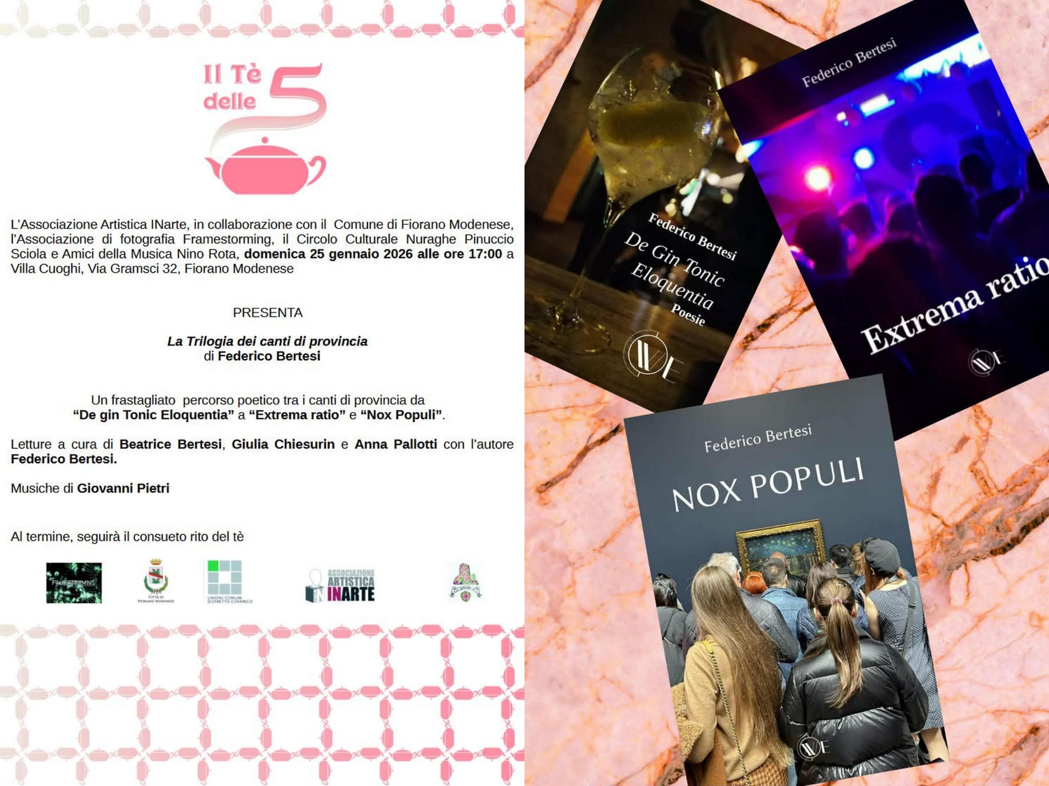 L’Associazione Artistica INarte, in collaborazione con il Comune di Fiorano Modenese, l’Associazione di fotografia Framestorming, il Circolo Culturale Nuraghe Pinuccio Sciola e Amici della Musica Nino Rota, presenta un nuovo appuntamento della rassegna Il Tè delle 5.