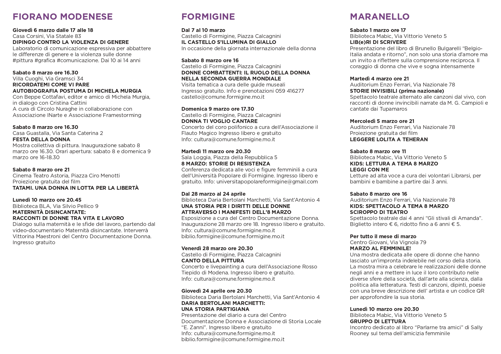 Orari apertura: sabato 8 e domenica 9 marzo ore 16-18.30