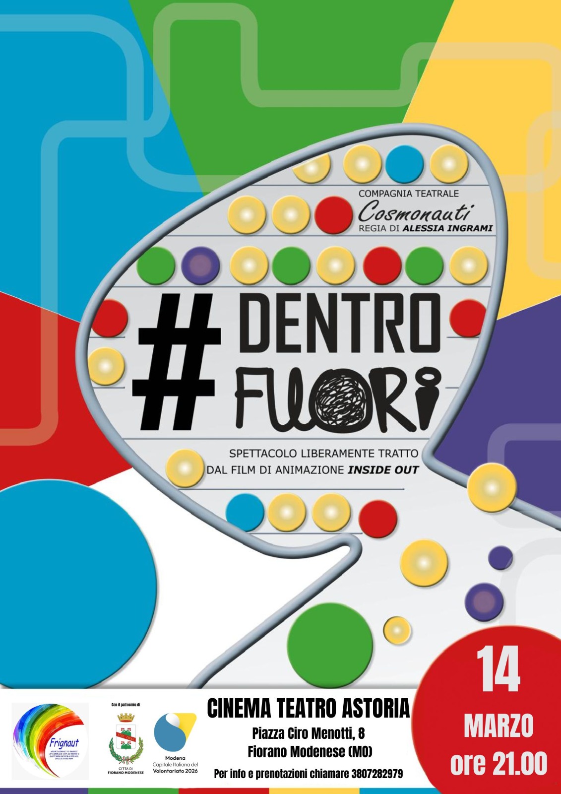 La compagnia teatrale Cosmonauti, con la regia di Alessia Ingrami, presenta lo spettacolo teatrale "Dentro Fuori", liberamente tratto dal film di animazione "Inside Out".