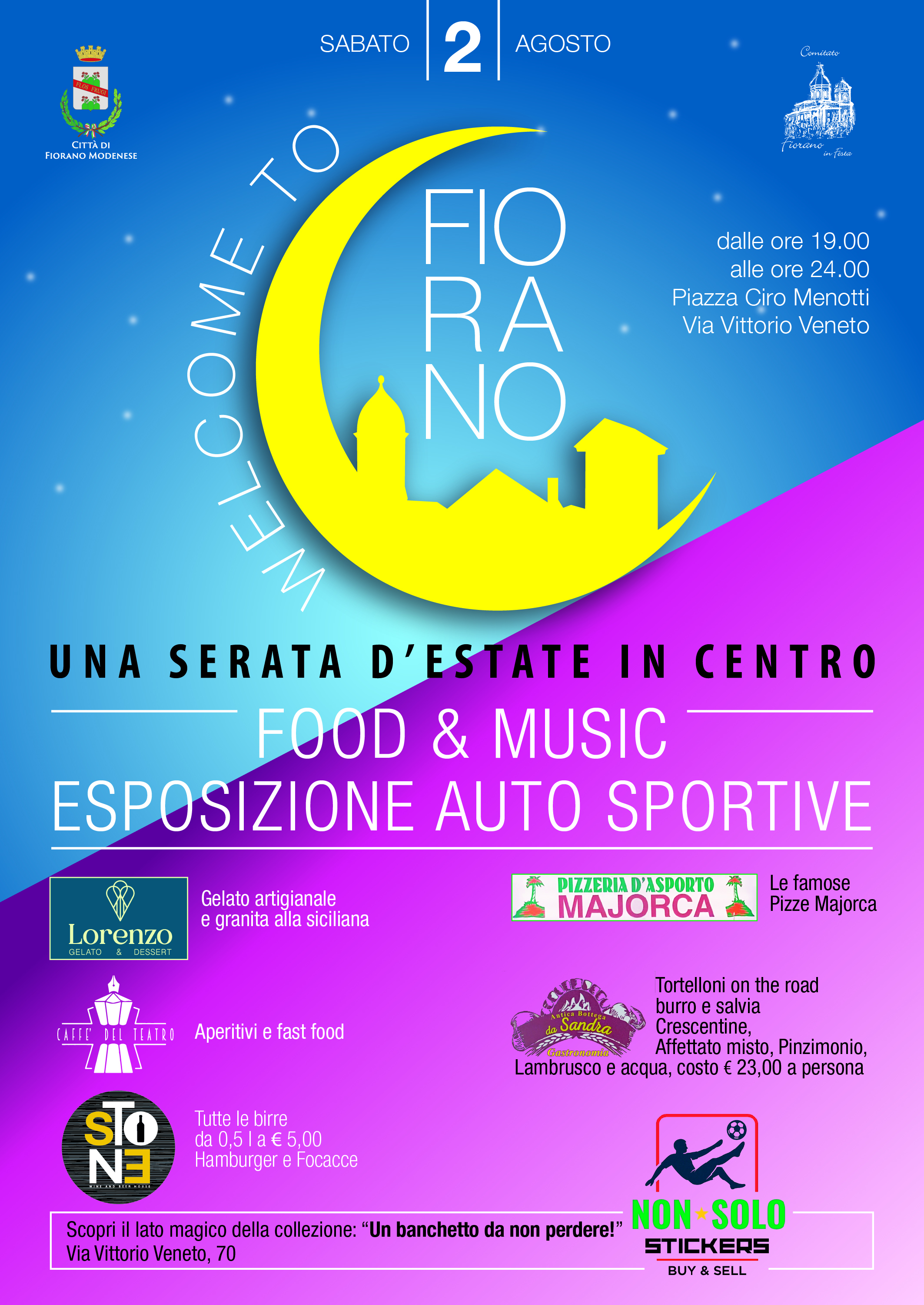 Sabato 2 agosto 2025 il centro di Fiorano si anima con “Welcome to Fiorano”: dalle ore 19.00 alle 24.00, in piazza Ciro Menotti e via Vittorio Veneto saranno esposte auto sportive e sarà possibile mangiare e bere ai tavolini all’aperto degli esercizi commerciali della zona, ascoltando buona musica.